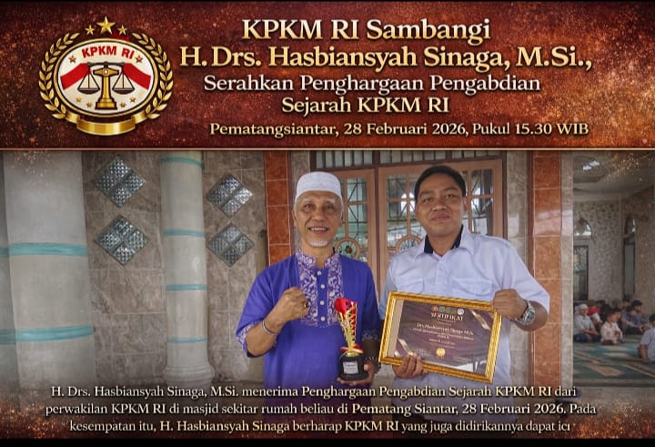 Koranaspirasi.com|Pematang Siantar – Jajaran Kongres Pemberantasan Korupsi Manipulatif Rakyat Indonesia (KPKM RI) melakukan kunjungan silaturahmi sekaligus penyerahan Penghargaan Pengabdian Sejarah KPKM RI kepada Hasbiansyah Sinaga, M.Si. sebagai bentuk penghormatan atas dedikasi dan kontribusinya dalam perjalanan serta pembangunan organisasi, 28 Februari 2026.